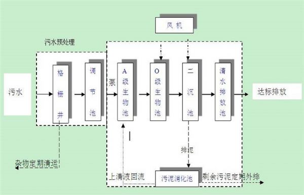 污水由排水系统收集后,进入污水处理站的格栅井,去除颗粒杂物后,进入调节池,进行均质均量,调节池设置液位控制器,再经液位控制仪传递信号,由提升泵送至A级生物接触氧化池,进行酸化水解和硝化反硝化,降低有机物浓度,去除部分氨氮,