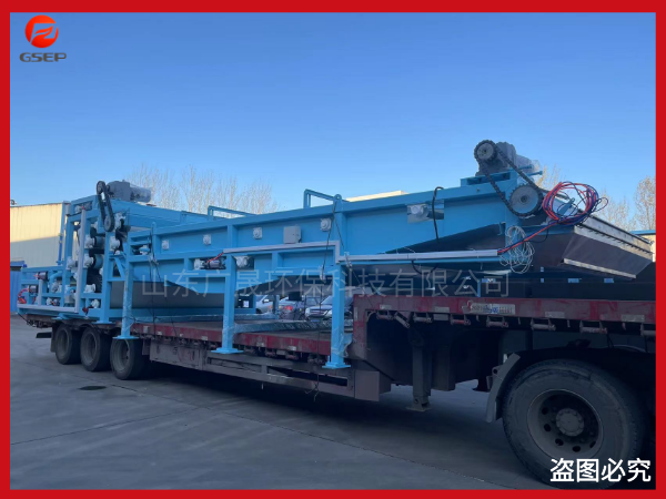 4.对夹挤压辊(或带)高压脱水区,污泥脱离中压区后就进入高压区,污泥在此区内受到1~3组对夹辊(或带)挤压,经过挤压后体积大幅收缩,污泥内的间隙游离水被充分挤出,此时,形成含固率较高的滤饼,分体式浓缩带式污泥脱水机特别适用大型矿山尾泥、大型洗砂场,石场制砂泥浆脱水、陶瓷原料泥浆、洗山砂、土包沙泥浆脱水、河道清淤等工业污泥深度脱水处理和大型污水厂的使用。