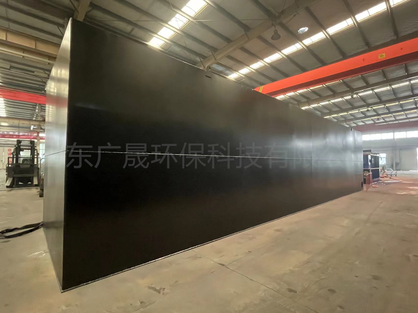 其一侧设置有进水口,反应池内设置有浸没式帘式膜组件,容纳有活性污泥,周边曝气和膜片曝气管路与风机联通,膜组件上配套的集水管与抽吸泵联通,待处理的污水通过进水口进入 MBR 生化反应池,污水在反应池内的 HRT 为 5h。经反应池内的活性污泥降解后,通过抗污染平板膜组件,然后由抽吸泵吸出进入清水消毒池。反应池内还设置有污泥提升泵,可以把多余的污泥提升到污泥硝化池内。反应池上部开有溢流口,可以使污水自流到箱外调节池。下部一侧开放空口,便于池内结构维护、清理。