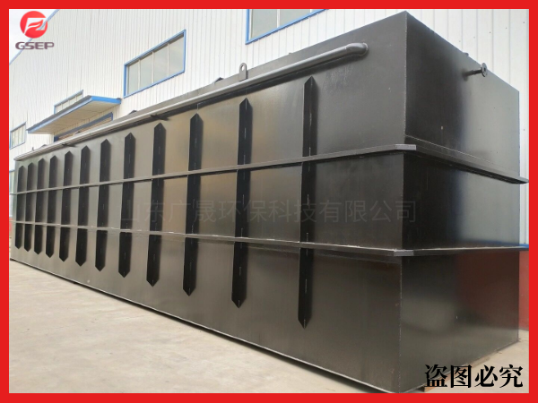 其一侧设置有进水口,反应池内设置有浸没式帘式膜组件,容纳有活性污泥,周边曝气和膜片曝气管路与风机联通,膜组件上配套的集水管与抽吸泵联通,待处理的污水通过进水口进入 MBR 生化反应池,污水在反应池内的 HRT 为 5h。经反应池内的活性污泥降解后,通过抗污染平板膜组件,然后由抽吸泵吸出进入清水消毒池。反应池内还设置有污泥提升泵,可以把多余的污泥提升到污泥硝化池内。反应池上部开有溢流口,可以使污水自流到箱外调节池。下部一侧开放空口,便于池内结构维护、清理。